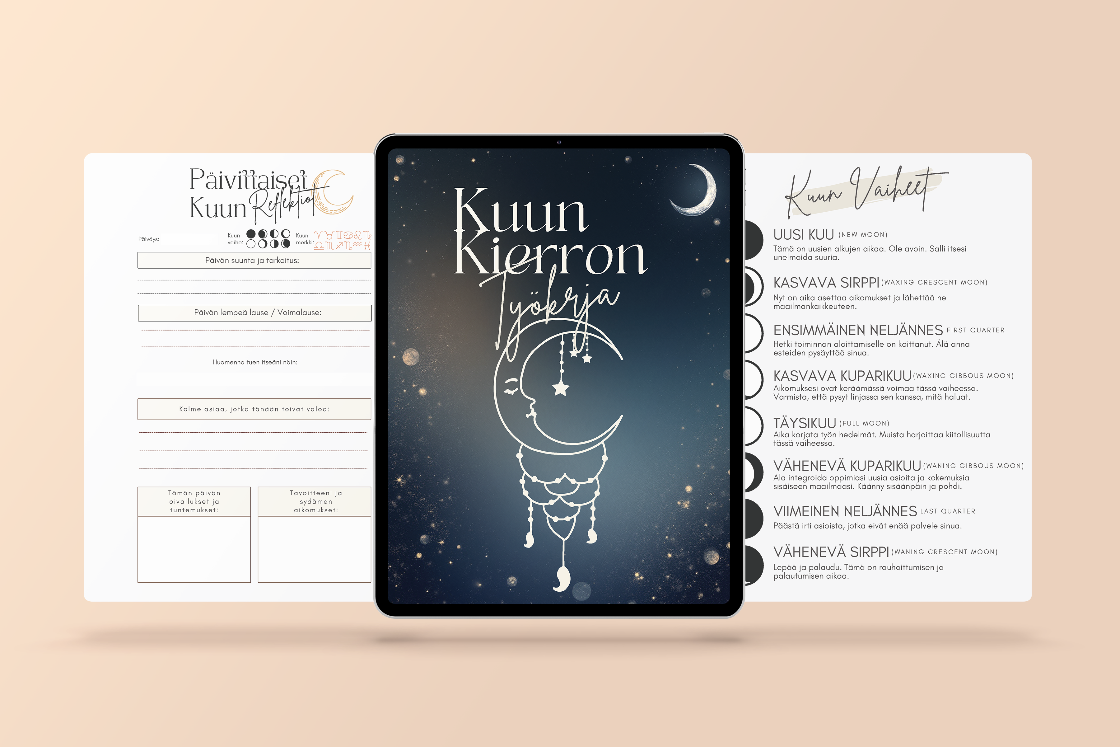 Työkirja on kauniisti toteutettu, helposti ladattava digitaalinen PDF-opas, joka auttaa sinua elämään luonnollisessa rytmissä Kuun energioiden kanssa. Työkirja tarjoaa visuaalisen inspiraation lisäksi konkreettisia työkaluja oman sisäisen syklin seuraamiseen ja sen tukemiseen. Lataa ilmaiseksi ja aloita matkasi Kuun viisauden äärelle!